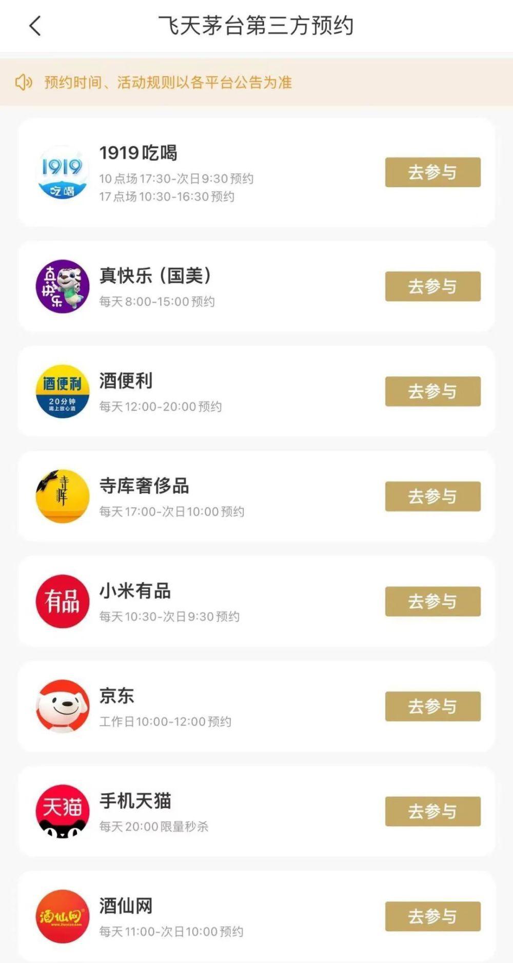 " 京东是每天中午 12:00,天猫是每天晚上 8:00,苏宁易购则是每天上午 9:30。" 小风介绍道,在 "i 茅台 "App 首页下滑,有个第三方预约渠道,里面列出了包括十多个第三方平台," 都需要下载第三方 App,几乎每个平台都需要拼手速,运气很重要。"