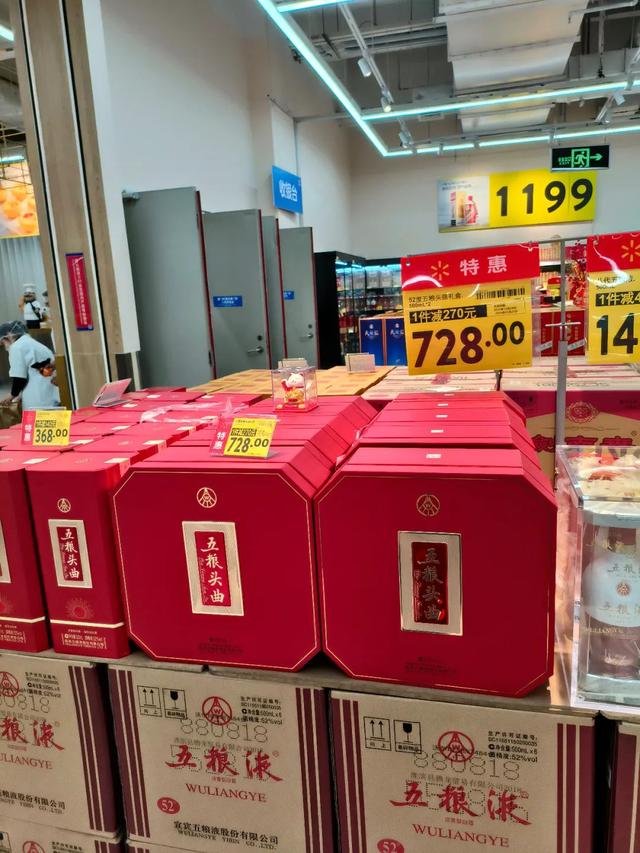 在沃尔玛商超记者看到,八代五粮液原售价为1499元,近期降价400元,折后每瓶售价1099元。七代五粮液的优惠力度也比较大,近期降价380元,折后每瓶的售价为1119元。