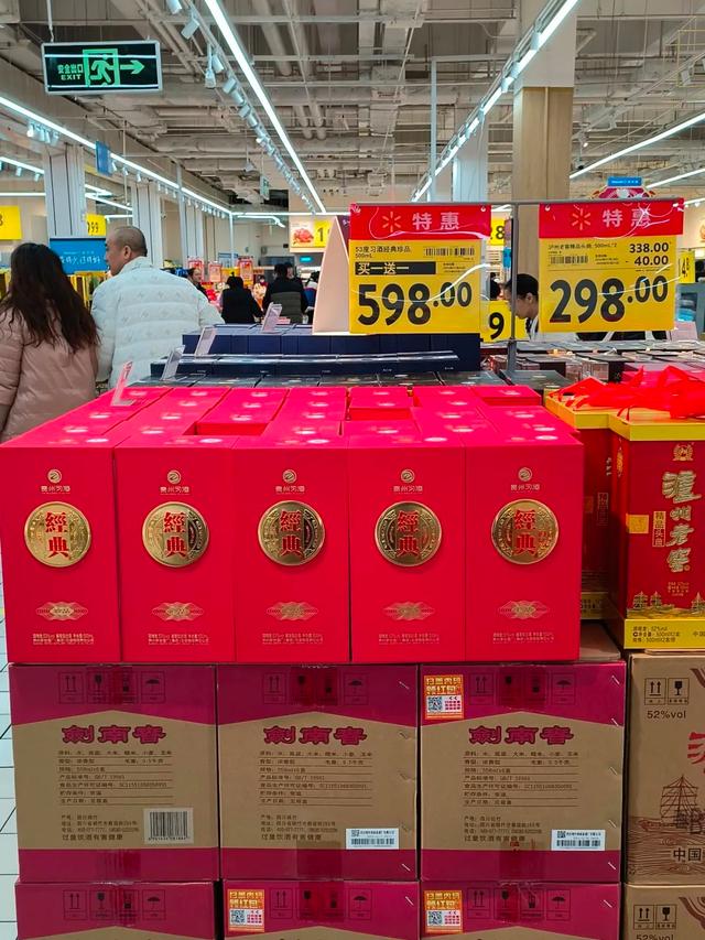 其他白酒品牌也在不同程度上给出了折扣,以吸引消费者的目光。例如,在该商超中,53度经典习酒的售价是598元,但可以买一送一,相当于每瓶的价格为299元。泸州老窖精品头曲的售价为338元,折后每瓶价格为298元。
