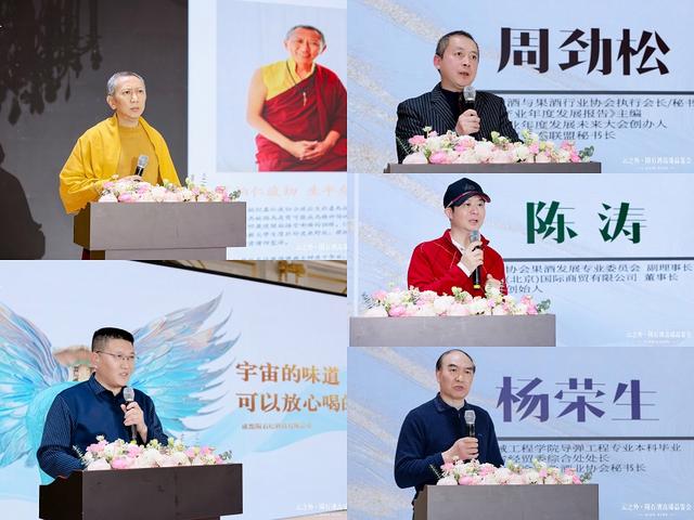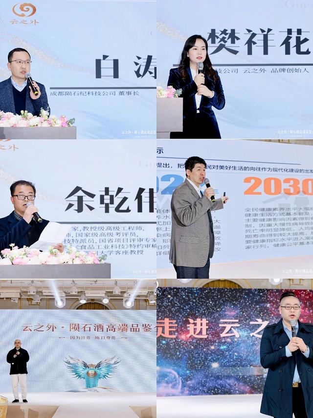 伴随云之外新颖吸睛的宣传片大屏播出,本次品鉴会正式拉开序幕。中国酒业协会金三角行业协会秘书长杨荣生先生、四川省地质调查院正高级工程师金立新先生、四川省葡萄酒与果酒行业协会执行会长/秘书长周劲松先生、冰青品牌刨始人陈涛先生、四川玛昀科技公司云之外品牌创始人樊祥花女士、成都陨石纪文化科技有限公司联合创始人/执行董事白涛先生、成都陨石纪科技公司副总裁徐自强先生先行致辞,随后夏铂坦真.仁波切上师致辞;四川和平成就未来文化旅游发展公司董事长胡晓晴女士、中国营养协会秘书长贾健斌先生、中国陨石科普产业协同创新平台常务副主席金灵先生等分别进行了致辞。