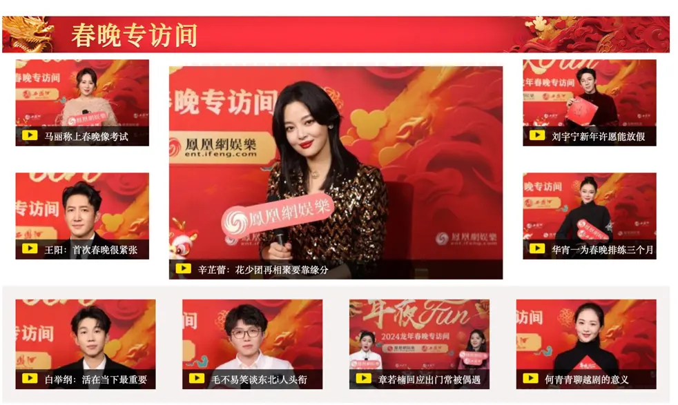 2024年围绕为“龙年喝西凤,龙凤呈祥”主题,凤凰网娱乐和西凤酒联手打造春晚探班、主题短片、春晚采访间、龙年时尚大片等系列策划,在扎根日常生活场景,与受众建立情感连接和共鸣的基础上,借助数字科技的力量,创新形态,孵化更多元化的内容产品,同时借助短视频、微博等社交平台,让受众有更高的能动性和参与感。