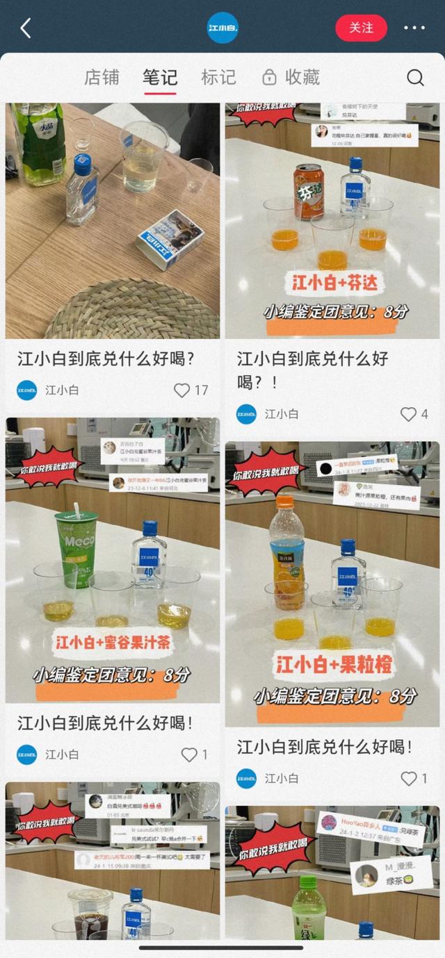 《消费者报道》注意到,在某社交平台上有关江小白的饮用讨论帖文中,大多为混合各种软饮的喝法,纯饮的讨论在少数,就连江小白的官方账号页面也以兑饮喝法的内容刷屏。