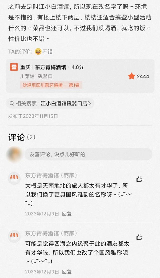 不仅如此,《消费者报道》注意到,位于重庆磁器口道场的门店已更名为“东方青梅酒馆”。该门店在某生活推荐平台团购套餐出现“梅见冰淇淋”“白梅见”等字眼。