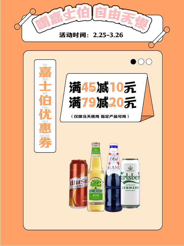 职场发展道阻且长,自2月25日至3月26日,永辉生活-咏悦汇酒库推出嘉士伯品牌优惠券助力消费者自在追光,包括满45减10元、满79减20元两种券(仅限当天可用 指定产品可用),有嘉士伯啤酒罐装500ml、1664白啤小瓶330ml、乌苏啤酒500ml等产品参与活动,喝嘉士伯,醇香四溢,自由无惧,尽展风采。