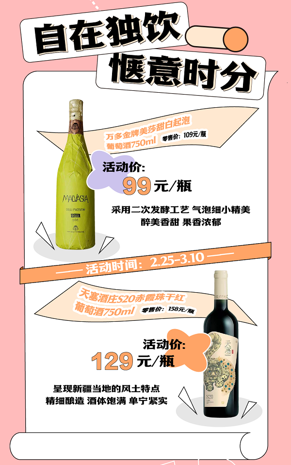 此外,自2月25日至3月10日,永辉生活-咏悦汇酒库推出葡萄酒价格优惠活动,万多金牌美莎甜白起泡葡萄酒750ml活动价99元/瓶(零售价109元/瓶),采用二次发酵工艺,气泡细小精美,醉美香甜,果香浓郁,天塞酒庄S20赤霞珠干红葡萄酒750ml活动价129元/瓶(零售价158元/瓶),呈现新疆当地的风土特点,精细酿造,酒体饱满,单宁紧实。