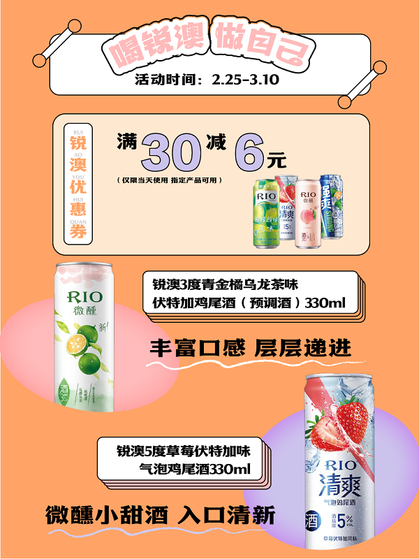 网络与现实中对女性胖瘦的议论不在少数,部分的议论将纤瘦的身材作为美的衡量尺度,但瘦并非美的全部,女性自己的身体,也并非是他人的景观。千面千美,美丽没有标准答案,悦纳自己,独立而自信才是美的恰当诠释。因此,自2月25日至3月10日,永辉生活-咏悦汇酒库推出锐澳品牌满30减6元优惠券(仅限当天使用 指定产品可用),有锐澳微醺六联包鸡尾酒330ml*6、锐澳白桃白兰地味鸡尾酒(预调酒)330ml、锐澳柠檬朗姆味鸡尾酒(预调酒)330ml等产品参与活动,锐澳悦己时刻,做真实的自己。