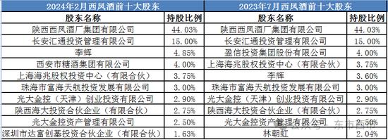 2023年,西凤酒曾在西部产权交易所发布增资扩股公告,7月14日公开的股东名单显示,西凤酒一共有41位股东。对比两份名单里前十大股东,原第五大股东李辉持股比例上升,达到4.85%,顶替应盈信投资成为第三大股东。