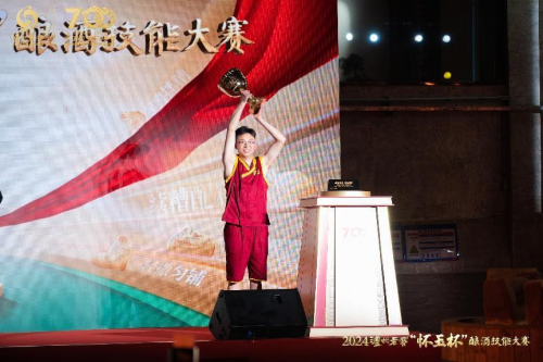 2023泸州老窖“怀玉杯”酿酒技能大赛总冠军何先强再度登顶,高举2024冠军奖杯庆祝守擂成功