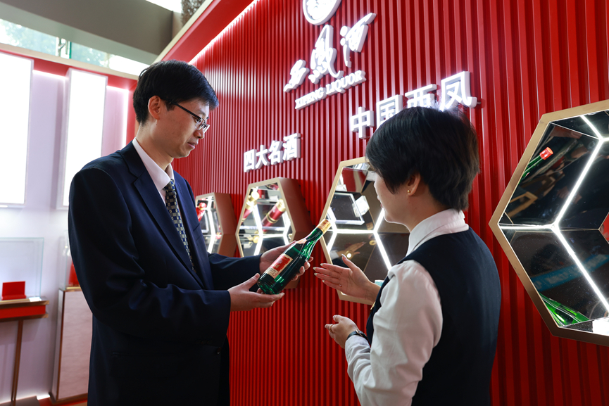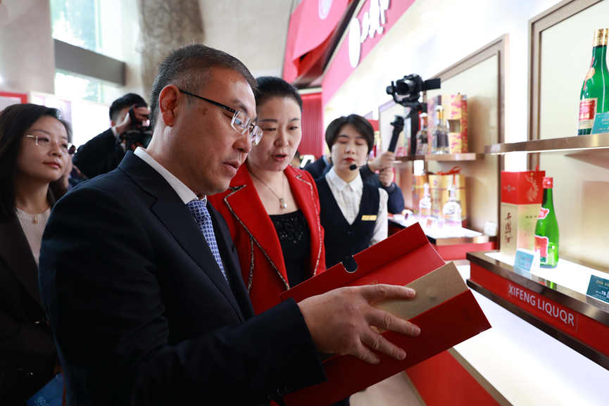 图为陕西西凤酒股份有限公司总经理张周虎参观产品展台