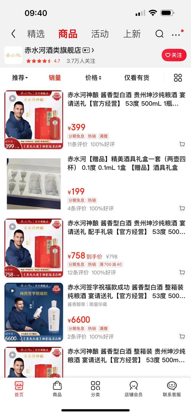 自称是品牌销售的展区工作人员称,目前赤水河酒旗下产品在淘宝、抖音等平台上都有在卖,并确认知名球星梅西仍是其品牌代言人。
