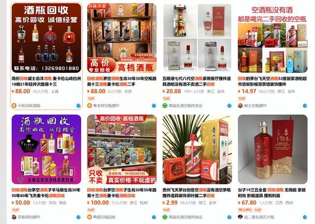 记者在电商平台搜索回收酒瓶关键词发现,有不少店铺都对外收购茅台等高档白酒酒瓶,价格也各不相同,其中收购茅台酒瓶的最多。