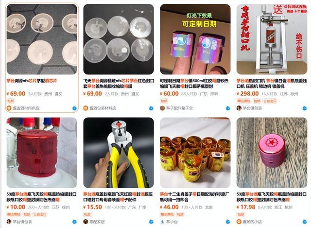 在电商平台上,配合造假的配件和专业工具也都有在销售,比如号称正版的飞天茅台飘带售价13.9元起,而搜索茅台酒帽,也有多家店铺在销售,还可以定制日期。