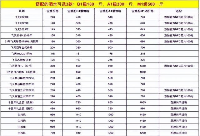 有网店客服表示,目前收购2023年的飞天茅台空瓶在40元/个左右,15年茅台整套在200元左右,而生肖茅台的空瓶价格更高,一般在200元/个左右,特殊年份的还可以卖到上千元。