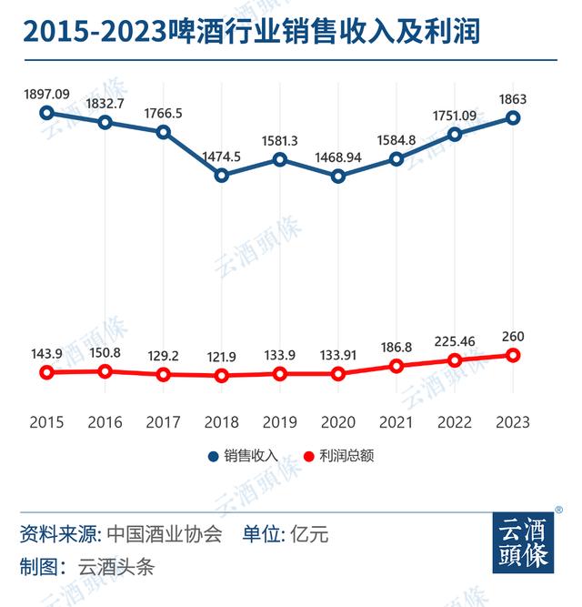 2023年,全国啤酒行业实现总产量3789万千升,同比增长0.8%,实现销售收入1863亿元,同比增长8.6%;实现利润总额260亿元,同比增长15.1%。啤酒产业利润增幅连续三年超过产量和销售收入。