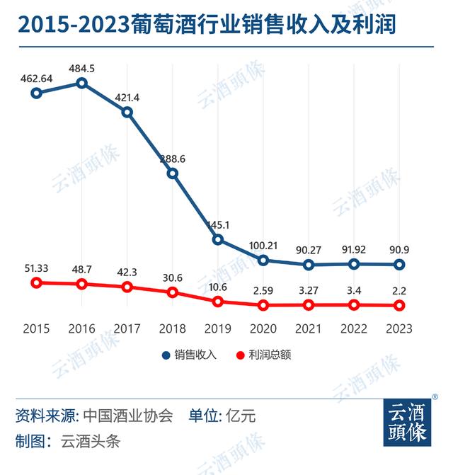 中国酒业协会数据显示:2023年,全国葡萄酒行业完成酿酒总产量30万千升,同比增长3.4%;累计完成销售收入90.9亿元,同比增长4.8%;累计实现利润总额2.2亿元,同比增长2.8%。