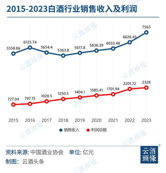 2023年,全国白酒行业实现总产量629万千升,同比下降5.1%;完成销售收入7563亿元,同比增加9.7%;实现利润总额2328亿元,同比增长7.5%。白酒产量下滑但营收利润保持增长,市场进一步向高端化集中。