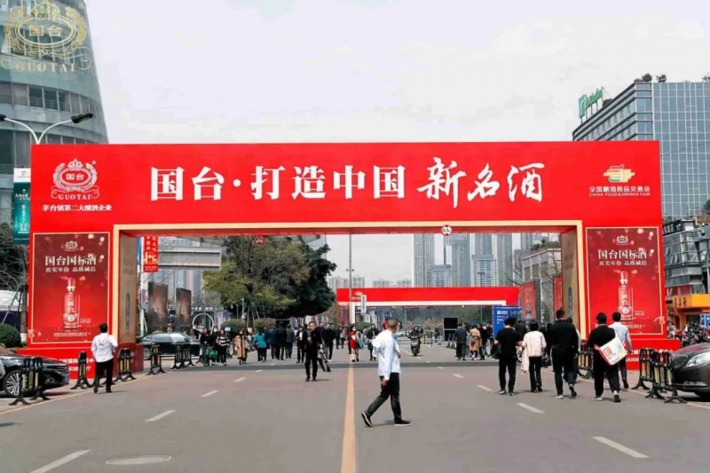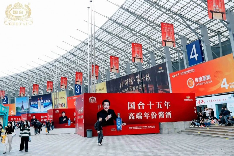 在主会展外部主通道,国台树起了“国台·打造中国新名酒”的广告门楼,在展示企业愿景的同时,也重点突出了两个大单品——国台国标酒和国台十五年。在主会展的内部广场,国台布置了4面环绕的广告墙,“国台红”成为会展中心耀眼的颜色,吸睛无数。