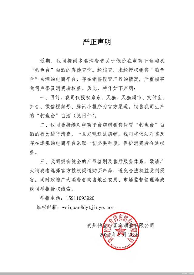 钓鱼台酒业针对电商平台低价售酒问题发布声明