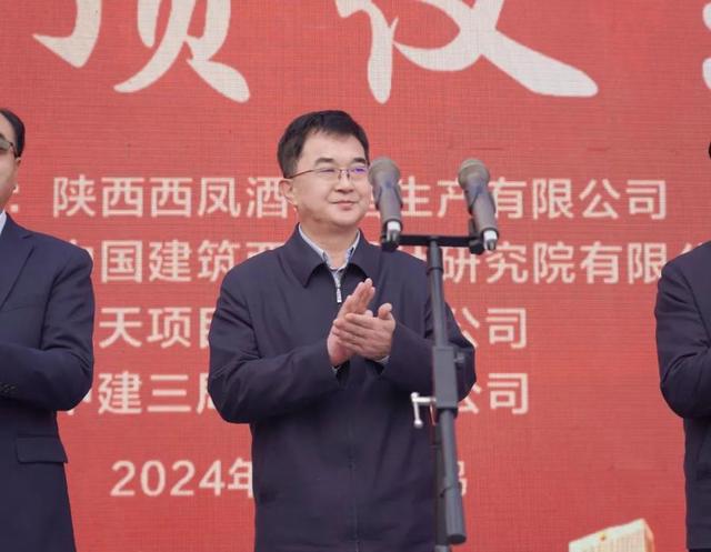 仪式上,陈爱民宣布项目主体结构顺利封顶。在一片热烈的气氛下,与会领导共同为西凤酒7万吨制曲项目封顶。西凤酒10万吨优质基酒及配套生产项目—7万吨制曲系统子项目位于宝鸡市凤翔区柳林镇环城北路南侧,洛西路西侧,项目占地面积约17.8万平方米,总建筑面积约28万平方米,包括1栋制曲大楼、2栋曲库大楼、2栋曲房楼、1栋曲粮接收塔、1栋曲粮筒仓(12个简仓)及配套道路等。工程自2023年7月1日开工建设,历时9个月,在各参建单位的共同努力下,实现了“万丈高楼平地起”。项目建成后,对于奠定西凤酒的行业地位、建设中国西凤酒城、健全宝鸡产业链群、助力西凤事业实现新跨越都具有重要的战略意义。