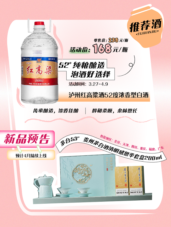 为实现青梅泡酒恰合心意,永辉生活-咏悦汇酒库倾情推荐泡酒好选择泸州红高粱酒52度浓香型白酒,52°纯粮酿造,醇和柔顺,余味悠长,自3月27日至4月9日,泸州红高粱酒52度浓香型白酒5L活动价168元/瓶(零售价238元/瓶),四月不仅是泡酒的好时节,也是踏青的好时节,清明将至,永辉生活-咏悦汇酒库推出新品上市活动,茅台53°贵州茅台酒清明感恩季套盒200ml(售货地区:北京、天津、四川、重庆、福建、广东),情如潺潺,心似盈盈,一壶二杯,携酒祭祖郊游,感受浓浓春意。
