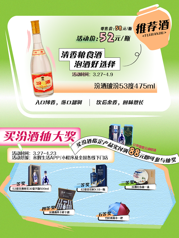 梅子时节,永辉生活-咏悦汇酒库倾情推荐泡酒好选择汾酒佳酿,推出汾酒品牌实惠活动,自3月27日至4月9日,汾酒玻汾53度475ml活动价52元/瓶(零售价58元/瓶),清香粮食酒,入口绵香,落口甜润。自3月27日至4月23日,在永辉生活APP/小程序及全国各线下门店购买汾酒指定商品实付满88元还可参加抽奖(订单需要核销),奖品包含53度汾酒青花30复兴版500ml、42度杏花村X18一瓶、汾酒纪念盘等,购汾酒,享好礼,有竹叶青38度酒500ml、汾酒53度青花(20)500ml、汾酒53度青花30复兴版白酒500ml等产品参与活动,典雅飘香,回味悠长。