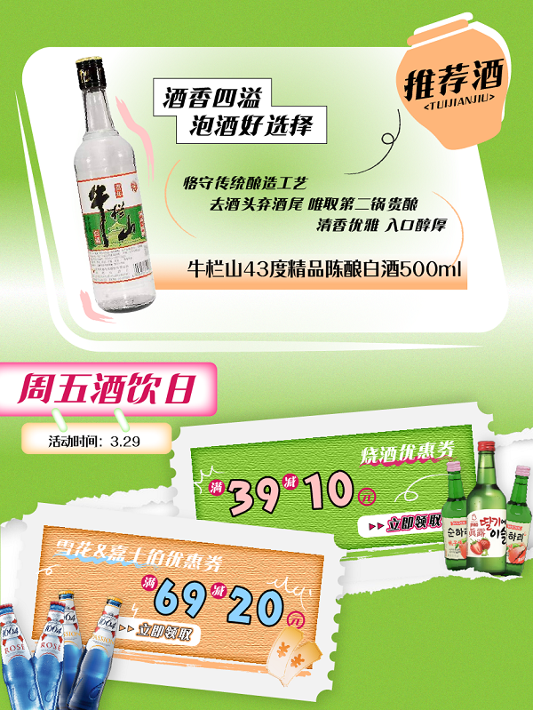 而为了让广大用户能够酿造出甜美桃子酒,永辉生活-咏悦汇酒库倾情推荐泡酒好选择牛栏山43度精品陈酿白酒500ml,去酒头弃酒尾,唯取第二锅贵酿,清香优雅,酒香四溢。泡酒是一门等待的学问,心急的酒友不妨先在周五酒饮日畅快开喝,过过酒瘾,3月29日,永辉生活-咏悦汇酒库会发放雪花品牌与嘉士伯品牌满69减20元优惠券,有1664桃红啤酒330ml、1664百香果风味啤酒330ml、夏日纷芒果味酒330ml等产品参与活动,另外,永辉生活-咏悦汇酒库还将发放满39减10元烧酒优惠券,有初饮初乐桃子味配制酒360ml、真露桃子味利口酒360mL、真露草莓味利口酒360ml等产品参与活动