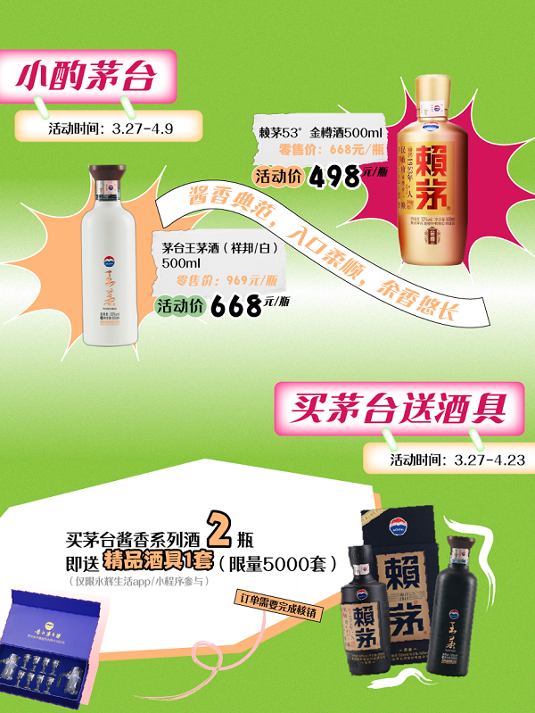 同时,永辉生活-咏悦汇酒库推出茅台价格优惠活动,茅台王茅酒(祥邦/白)500ml活动价668元/瓶(零售价969元/瓶),酱香清雅,酒体丰满,回味无穷,赖茅53°金樽酒500ml活动价498元/瓶(零售价668元/瓶),酱香典范,入口柔顺,余香悠长。自3月27日至4月23日,在永辉生活APP/小程序下单茅台酱香系列酒满2瓶即送1套精品酒具(限量5000套,订单需要核销),参与活动的产品有茅台王茅酒(祥雅/黑)500ml、茅台华茅酒(蓝)500ml、赖茅(传承)53度500ml,好酒配好具,饮酒更有韵味。