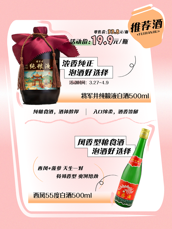 三两嫣红桃花酿,醉饮人间春一场。阳春三月,制作一杯桃花酿恰恰能收获应季微醺的美好,轻抿一口,醇香而芬芳。首先用淡盐水浸泡清洗去根蒂的新鲜桃花花瓣250g,并晾干水分,再铺一层白砂糖在干净的玻璃瓶底,将桃花、白芷粉20g、白酒2500g倒入瓶子里密封保存,等待一个月后即可饮用。桃花酿酒,不负春光,永辉生活-咏悦汇酒库倾情推荐泡酒好选择将军井纯粮液窖龄30白酒52度500ml,纯粮食酒,入口绵柔,浓香纯正,自3月27日至4月9日,将军井纯粮液白酒500ml活动价19.9元(零售价33.8元/瓶)。