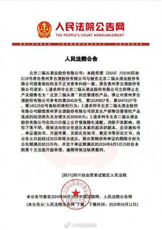 首页酒业资讯白酒 白酒 茅台起诉北京二锅头,索赔30万元! 未知 2024-04-12 10:34 白酒 人民法院公告网显示,近日,四川自由贸易试验区人民法院向北京二锅头酒业股份有限公司公告送达贵州茅台酒股份有限公司与该公司侵害商标权及不正当竞争纠纷案件起诉状副本及开庭传票 人民法院公告网显示,近日,四川自由贸易试验区人民法院向北京二锅头酒业股份有限公司公告送达贵州茅台酒股份有限公司与该公司侵害商标权及不正当竞争纠纷案件起诉状副本及开庭传票等。 公告内容显示,贵州茅台酒股份有限公司,请求法院判令北京二锅头酒业公司立即停止生产及销售名为“北京二锅头酒”的仿冒侵权产品,停止对贵州茅台酒股份有限公司享有的第284526号、第10195657号、第34474107号、第14012530号商标的侵权行为,赔偿贵州茅台酒股份有限公司经济损失及合理支出30万元,并在四川日报上公开登报赔礼道歉,消除不良影响。该案将于2024年6月5日开庭。 图源:商标网部分商标截图 官网显示,当前北京二锅头旗下有永丰牌、京王子、北京二锅头、永丰酒坊等系列产品。案件涉及包装侵权产品指的应是“北京二锅头”系列。 图源:北京二锅头酒业公司官网产品图 公开资料显示,北京二锅头酒业股份有限公司成立于2002年8月,系始建于1949年10月的国营北京大兴酒厂的改制企业。其中,公司旗下“永丰牌”商标2000年度、2004年度、2007年度连续三届被北京市工商行政管理局认定为北京市著名商标;2011年5月,“永丰”牌被中华人民共和国商务部评为中华老字号。 关于企业回应、争议产品生产及投放渠道等相关细节,中国网财经多次拨打北京二锅头官网电话进行联系,但电话始终无人接听 上一篇打造白酒即时零售行业标杆 洋河股份与美团闪购达成战略合作4月9日, 洋河股份 与 美团闪购 达成战略合作。双方将从数字化、营销、用户体验等多个方面深入合作,共同提升白酒品类在平台内的销售增长,打造行业标杆。 2023年初,洋河股份开启和美团 上一篇京东小时达“名酒保真”专区上线,保真正品名酒保障消费者购酒权益京东旗下即时零售业务京东小时达再放大招:4月9日,京东小时达正式上线名酒保真专区,联合京东酒世界、1919、酒仙、华致酒行等品牌酒类商家,和沃尔玛、华润万家、山姆、永辉、麦德龙 相关文章 酒业早参|丁雄军调研茅台酒生产;中酒协发布6项白酒酿造团标 封面观酒丨飞天茅台价格下跌上热搜,会是又一个“拐点”? 洋河董监高换届;最高法认定“金沙回沙酒”商标有效;茅台ESG报告首次明确议 贵州茅台酒股份有限公司入选国家级示范基地名单 肆拾玖坊:源自茅台镇,探索多彩酒文化 让记忆有形,让文化不息——中华酒致敬北京中轴线文化盛典圆满举办 著名财经作家吴晓波新作《茅台传》正式发布 “世界美酒特色产区•中国酒谷•湘西”战略框架协议签约仪式在北京举行 茅台集团成为第四届中国国际消费品博览会全球战略合作伙伴 3月30日!茅台品藏家联谊会第五季将在深圳举行