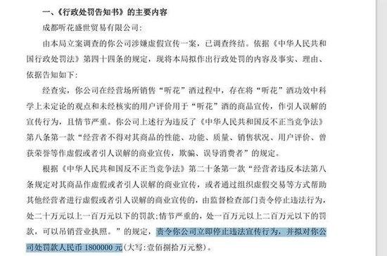 该告知书指出,经查实,听花盛世在经营场所销售“听花”酒过程中,存在将“听花”酒功效中科学上未定论的观点和未经核实的用户评价用于“听花”酒的商品宣传,作引人误解的宣传行为,且情节严重。责令该公司立即停止违法宣传行为,并拟对其罚款180万元。
