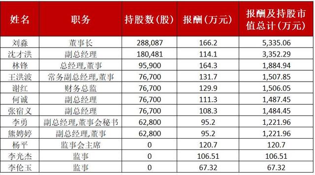 作为一家国企,泸州老窖的高管薪酬多数在百万元以上。最高是董事长刘淼超过166万元,总经理林锋薪酬164万元,常务副总经理王洪波年薪约132万排第三;财务总监谢红的薪酬约130万元,监事会主席薪酬杨平约121万元,也靠前。