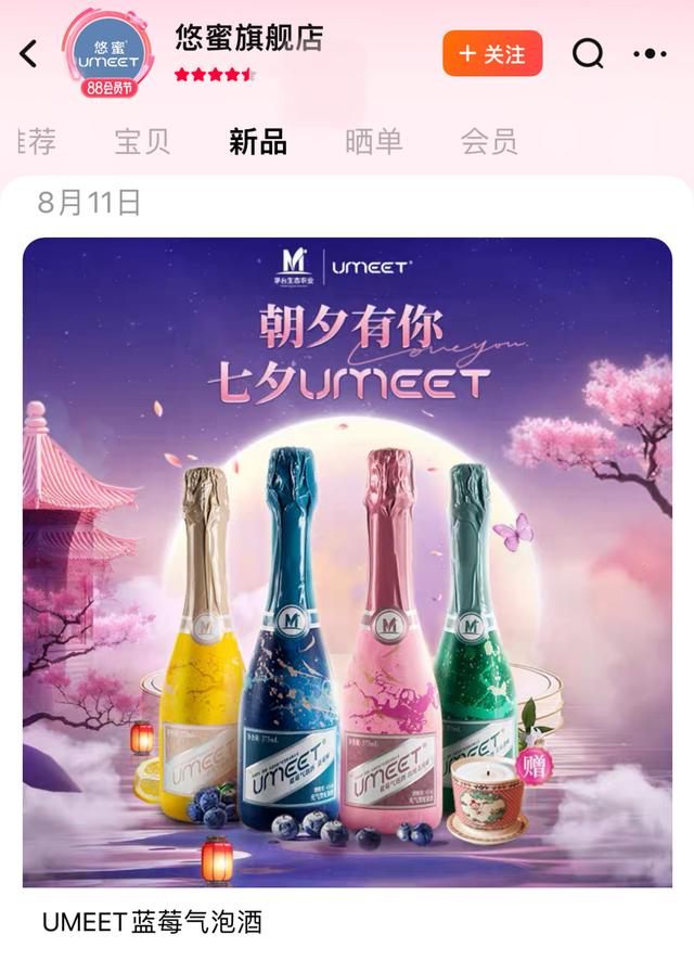 记者发现,UMEET蓝莓气泡酒新口味在多个平台上线,8月9日当天,UMEET蓝莓气泡酒又增加了“新成员”——“玫瑰荔枝味”新品在i茅台进行了全网首发,并同步启动了“悠蜜七夕 遇见永恒”新品首发活动:在8月9日00:00至8月15日23:59活动期间,在i茅台单笔订单购买两瓶及以上UMEET遇见生态美系列-蓝莓气泡酒(玫瑰荔枝+任意口味)的用户,即可获得精美的香氛蜡烛一份。