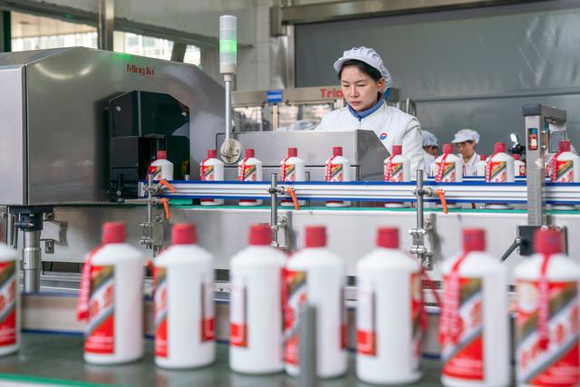 在茅台酒厂包装车间的生产线上,机器高速运转,员工们正热火朝天地进行包装工作。车间质量管理员正仔细查看贴标、喷码等包装生产环节,并不时从生产线上拿起茅台酒详细查看瓶身上的产品信息、包装细节,把好茅台酒生产质量的关口。