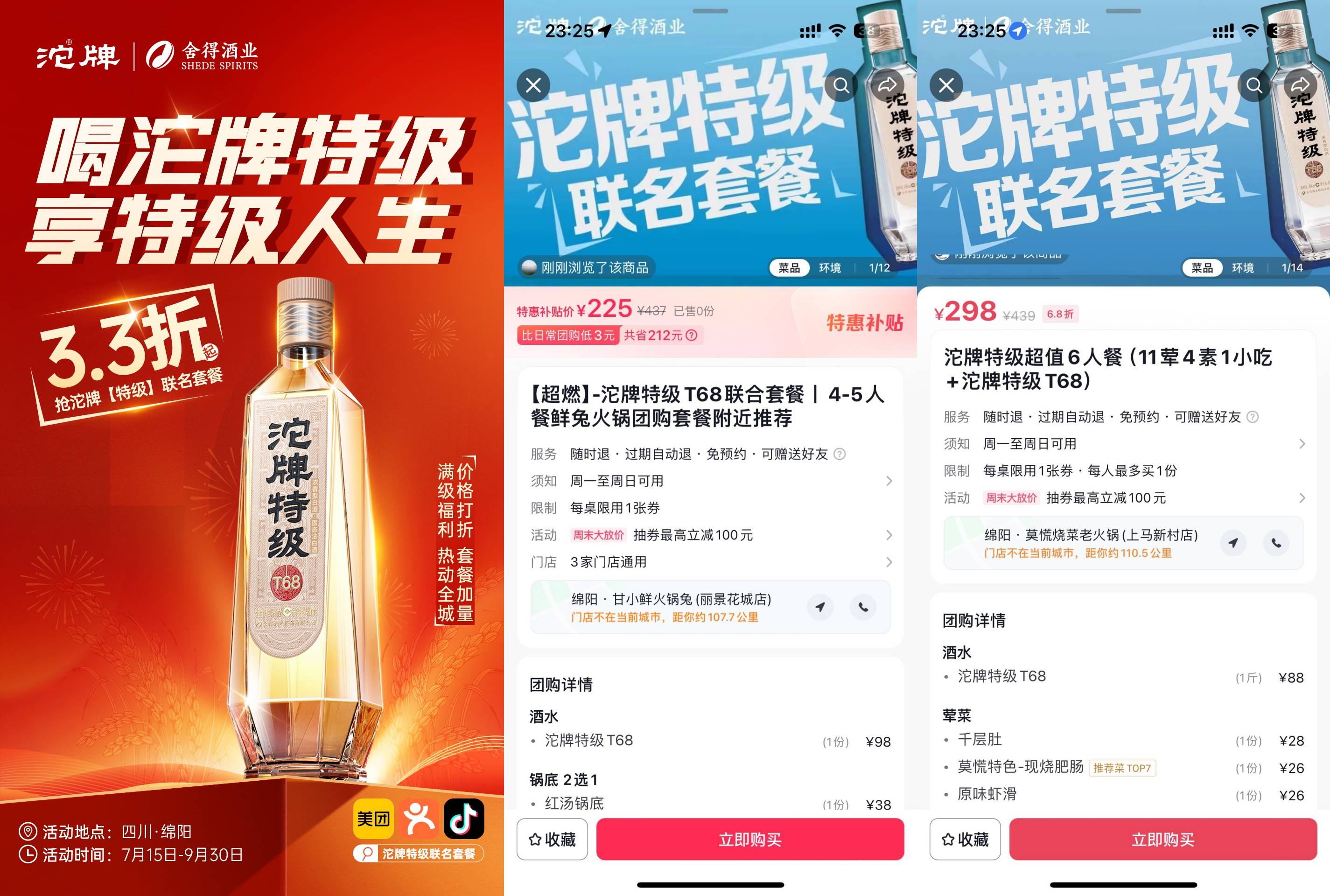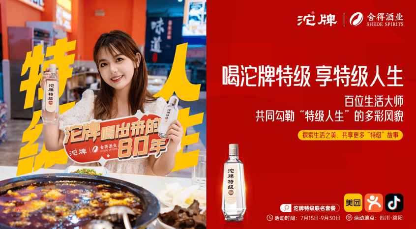自七月初,沱牌特级酒携手绵阳地区大牌餐饮门店进行深度合作,推出了【沱牌特级】专属美食套餐,将美酒与佳肴完美融合,为食客们带来了一场味蕾的特级享受,让消费者在品味地道川菜的同时,也能领略到沱牌特级酒的醇厚风味。让【特级】二字在绵阳全城的社交平台、团购平台形成物理资源占位,强势抢占用户心智,掀起了抢购热潮。