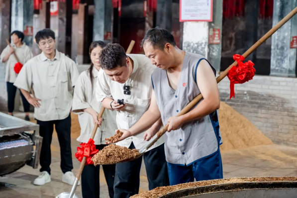 “起窖令下!”随着酿酒师傅与满怀期待的体验者们共同揭开明代古窖池的盖帘,一股源自发酵180天的醇厚粮食酵香瞬间充盈四周,仿佛时间的醇酿在这一刻被温柔地“叫醒”。