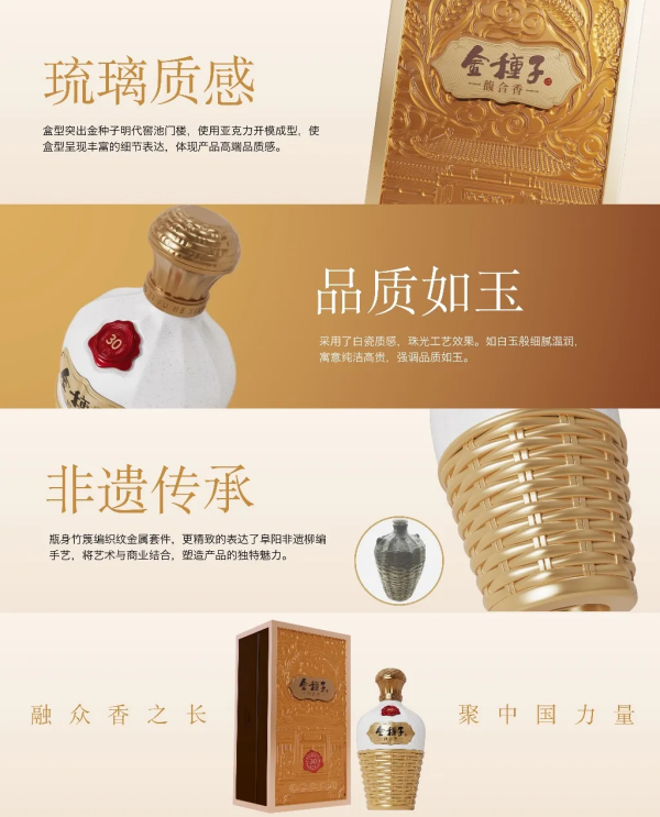 在产品设计上,馥30同样别具一格,由甲骨文创意事务所创始人、首席创意官刘文精心打造,瓶身融合现代与古典美学,采用白瓷材质,彰显高雅品质,特别融入阜阳非遗柳编元素,展现文化底蕴,寓意金种子人对美好生活的追求,饱满造型象征丰收,传递自然馈赠与美好生活。