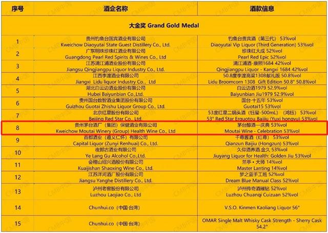 贵州茅台酒厂(集团)保健酒业公司旗下的茅台醇(庆典)获得大金奖,茅台醇(锦绣)获得金奖。