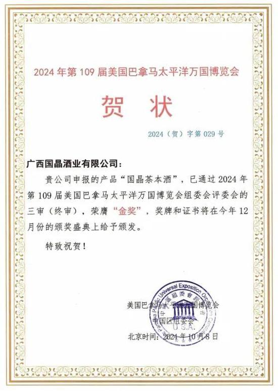 10月8日,美国巴拿马太平洋万国博览会中国区组委会向广西国晶酒业有限公司发来贺状,“国晶茶本酒”通过2024年第109届美国巴拿马太平洋万国博览会组委会评委会终审,荣膺“金奖”,奖牌和证书将在今年12月份的颁奖盛典上给予颁发。