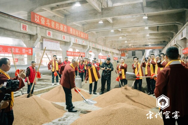 随后,集团董事长曹本强一行人浩浩荡荡地前往宋代官窖酒庄制酒车间,举行了盛大的下沙投产仪式。下沙是白酒酿造的关键环节,标志着新一年度酿酒周期的正式开始。在车间内,酒工们熟练地润粮、下沙,这为酿造出高品质的酱香酒奠定了坚实的基础。