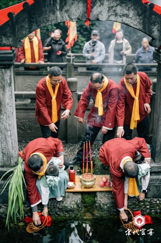 取得圣水后,队伍来到祭水台。酿酒大师净手焚香,迎接圣水。主祭曹本强率众在祭水台下净手,向孙全太等历代祖师祖师神位敬香烛、三拜九叩。“上苍造化,人为精灵。大地厚德,水如母亲……”祈福祭文颂声响彻宋代官窖酒庄。随后,曹本强宣布:“甲辰酒中酒集团酱香美酒,开酿!”