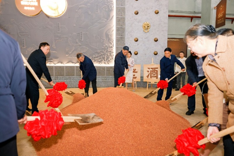 随着投产仪式正式启动,出席仪式的领导率先投入到润粮操作中。伴随着铿锵有力的号子,酒师们手中的铁锨不停翻转,红沙在空气中翩翩起舞并逐渐翻拌均匀,缓缓拉开新一年的酿酒生产。