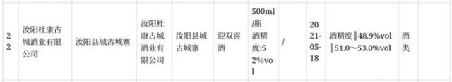 其中汝阳杜康古城酒业生产迎双喜酒500ml/瓶,酒精度:52%vol,2021-05-18)酒精度不符合相关产品执行标准要求被通告。