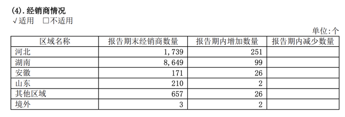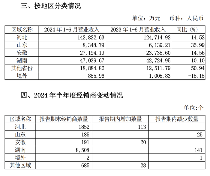 与此同时,老白干酒的省外市场也拓展不易,新客户开发难度较大。今年上半年,河北市场为老白干酒贡献了14.28亿元的营收,同比增长14.52%,占总营收的近六成。第二大市场湖南市场营收为4.7亿元,同比增长10.1%,增速不及河北省的同时,还减少了141家经销商,终端扩展受阻。