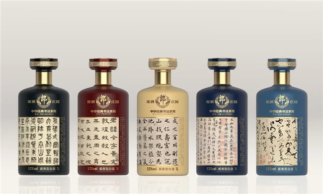 不同书体的各款酒有着独特亮点。比如郎酒庄园·中华经典书法系列(篆书),瓶身呈现李斯“秦·泰山刻石”这一篆书巅峰时刻,包装整体色彩搭配为黑与金,宛如历史和时间交织,是水墨与美酒的完美结合;郎酒庄园·中华经典书法系列(隶书),瓶身呈现王敞《曹全碑》,尽显汉隶秀美的极致之美;郎酒庄园·中华经典书法系列(楷书),瓶身环绕欧阳询“九成宫醴泉铭”,寓意着中国书法艺术循环往复、生生不息;郎酒庄园·中华经典书法系列(行书),外盒与瓶身分别呈现王羲之行书真迹及“天下第一行书”《兰亭集序》,瓶型色彩提炼自东晋青瓷,韵味独特;郎酒庄园·中华经典书法系列(草书),外盒与瓶身展现张旭的书法作品,彰显草书纯粹写意的魅力。