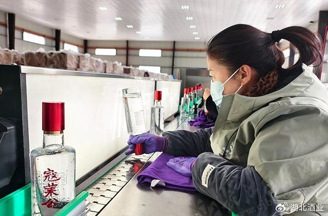 近日在湖北寇莱公酒业有限公司罐装生产车间,机器轰鸣,工人忙碌有序地操作设备,进行酒质检测,完成灌装、贴标、装箱等工序。