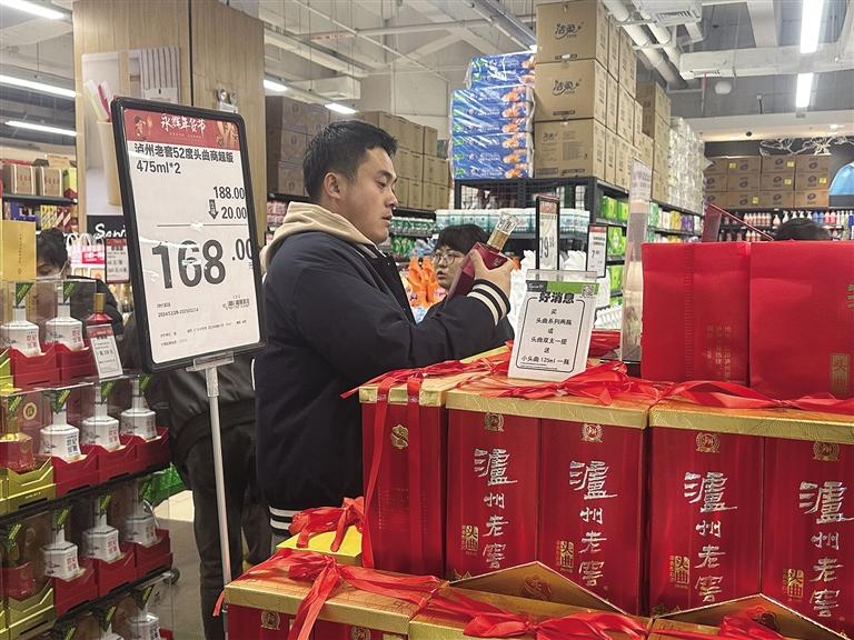 在永辉超市,这里的年货节正在如火如荼地进行着,在酒类区记者看到,春节期间很多酒类都有优惠,比如原价338元/瓶的茅台王子酒53度金王子500ml,现价218元/瓶;原价418元/瓶的赖茅53度端曲酒(2.0)500ml,现价330元/瓶;金徽珍品白酒500ml,买一赠一,2瓶208元;53度滨河九粮春白酒500ml,299元/瓶,一瓶立减30元……超市工作人员介绍,逢年过节酒都是饭桌上的必备品,随着春节临近,进场买酒的顾客逐渐增多。超市也早早开始了年货货源的安排及调配工作,保障供应。