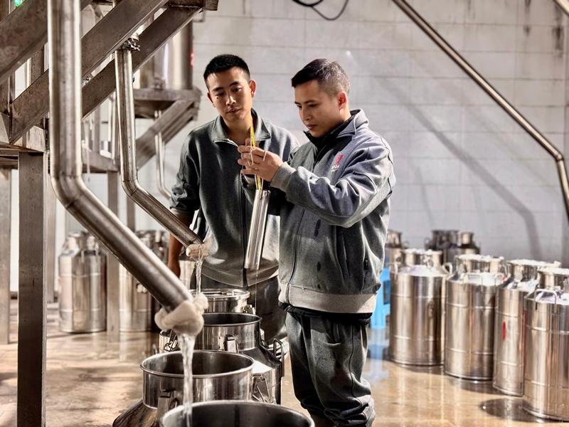 仁怀市茅台镇百年酒业有限公司技术人员下沉车间查看生产情况。