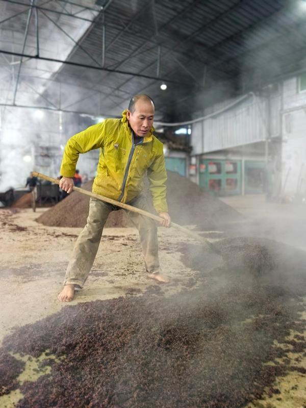 贵州氿洲道酒业有限公司工人正在摊凉。