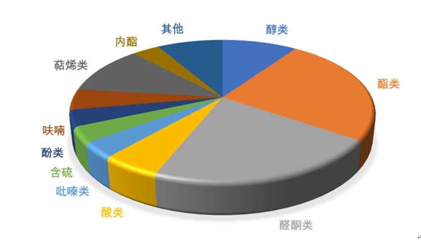 在不同产区的酱香型白酒中初步鉴定到395种具有潜在风味贡献的香气化合物,包括:酯类 (100)、芳香族 (56) 、醇类 (46)、酸 (19)、醛 (35)、酮 (35)、吡嗪 ( 19)、萜烯 (26)、呋喃 (36)、苯酚 (6) 和含硫化合物 (16)。
