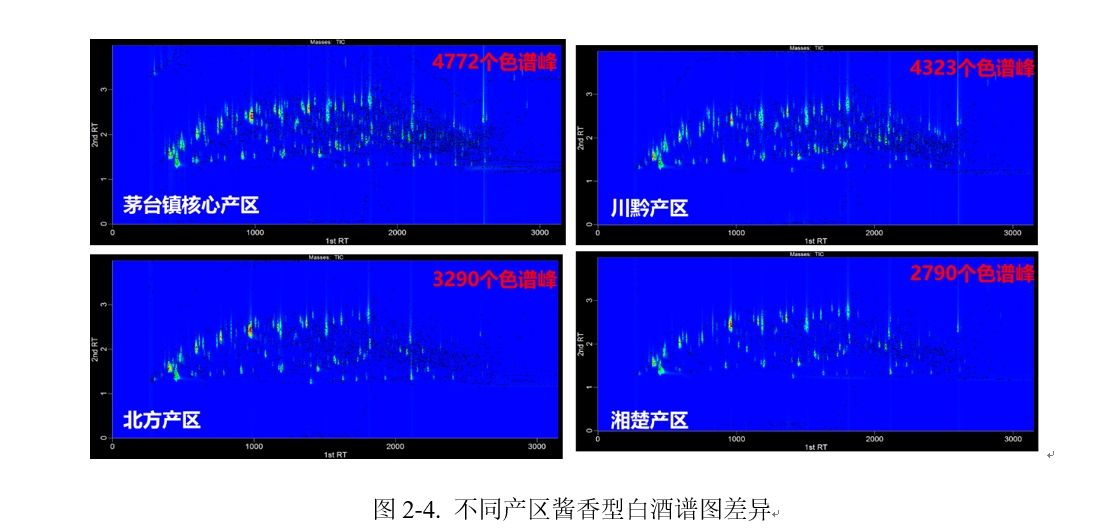 贵州国台数智酒业集团股份有限公司、江南大学酿造微生物与应用酶学实验室、中国酱香型白酒酿造研究院基于描述性分析及全二维气相色谱-飞行时间质谱(GC×GC–TOFMS)联用技术,以茅台镇核心产区、川黔产区、湘楚产区及北方产区的酱香型白酒为研究对象,针对其香气特征以及挥发性物质产区差异进行研究。